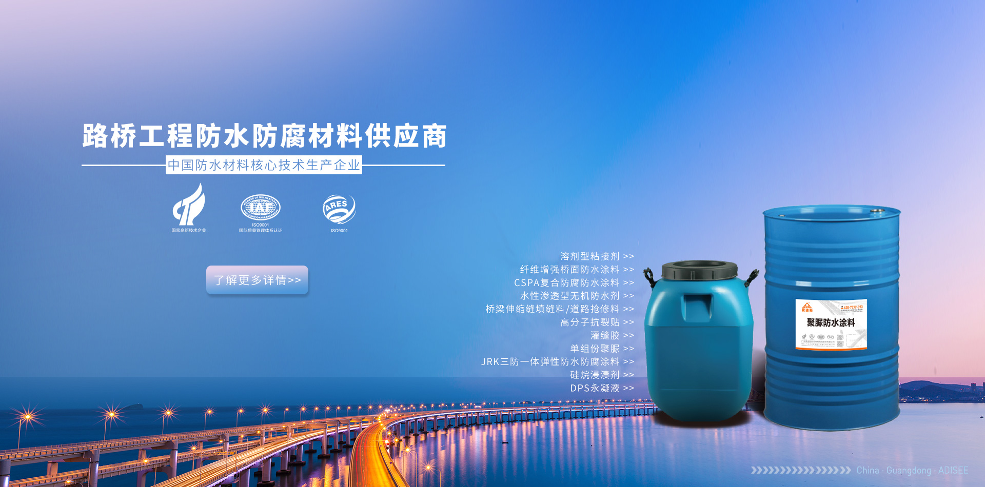 廣東愛迪斯新型材料科技有限公司廣州分公司 隔音隔熱系列 路橋及防腐防水系列 家裝工程防水系列 修繕補(bǔ)漏防水系列專業(yè)承接路橋防水防腐工程施工及防水材料銷售,路橋防水工程遍布全國(guó)各地,多年的技術(shù)經(jīng)驗(yàn)積累了一整套橋面防水病害處理方案,專業(yè)的路橋防水技術(shù),配套路橋防水施工設(shè)備,圓滿完成路橋防水施工任務(wù),用戶滿意度評(píng)價(jià)高,處橋梁防水行業(yè)技術(shù)領(lǐng)先水...